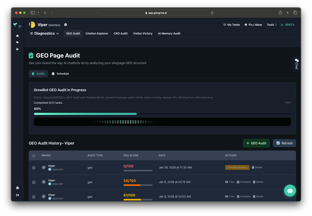 Follow-Up Scan: GrowBot automatically re-crawls your site after implementation to measure improvement, update your GEO Readiness Score, and advance your GEO Reqadiness.